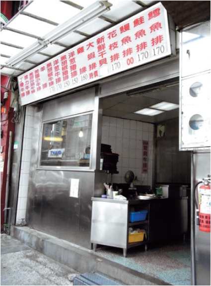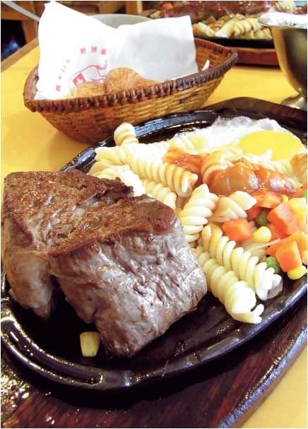 遠離人潮洶湧的士林夜市,招牌也幾乎斑剝看不清楚,卻隱藏著傳說中的美味牛排,重點光美味還不夠,超大份量更有物超所值的享受;除牛排外,雞排、豬排或海鮮排餐也都應有盡有,堪稱種類齊全,當然對我這種只吃牛排的人來說,隔壁桌幾乎大到掉出鐵盤的鱈魚排也讓我眼巴巴地看著,這大概就是所謂「吃在嘴裡,看著碗裡」的意思吧!