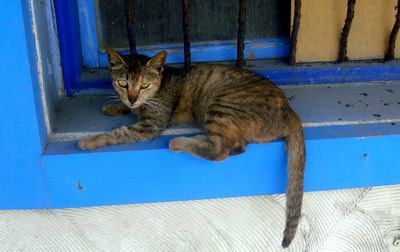 ↑夏日午後的七星潭社區,藍白外觀建築群有希臘風情,窗緣下的貓咪也顯得慵懶。