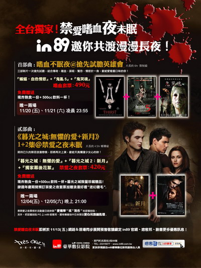 如果你也是一個愛看電影,也很關心電影動態的朋友們,一定會發現11月好像鬼影幢幢,小編我最期待的應該就是鬼亂5吧!這是鬼4虐第二級,再加上他的國籍是泰國,相信所有愛看鬼片的人一定跟我一樣充滿期待。不過如果你是恐怖片達人,光看個鬼亂5哪過癮,來自韓國的蝙蝠 血色情慾,也是11月頗值得期待的電影喔~而為了搭配11月一系列的恐怖片熱潮,in89豪華數位影院特別推出嗜血不眠夜@搶先試膽英雄會,讓所有愛看恐怖片的觀眾可以依次看個過癮。過了11月,12月最受注目的就是暮光之城2:新月,如果之前你沒來得及參與這場這場禁忌之愛,in89豪華數位影院也特別推出《暮光之城:無懼的愛+新月》1+2集@禁愛之夜未眠,一次看足1、2集喔!