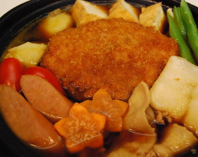 咖哩這種外來的口味可以說在日本被發揚光大,成為日本日常餐點中不可或缺的一份子,許多日本的店家利用咖哩香料,開發出各式各樣的創意料理。咖哩鍋源於日本的關西一帶,在大阪首先出現鍋燒咖哩烏龍麵,有些居酒屋則進一步做成咖哩火鍋的形式而大受好評。Rice Café承襲這一股創新的精神,將新鮮酥炸的豬排放入咖哩鍋中,豬排不但吸滿了咖哩醬汁,還保持酥脆的口感,除了豬排這個主角,鍋中的德式香腸、年糕、蔬菜等也扮演了重要的角色,讓整個咖哩鍋有一個均衡不膩的食感。鍋後的咖哩燉飯超級夠味好吃,吃過的人一致認為絕對不能錯過!