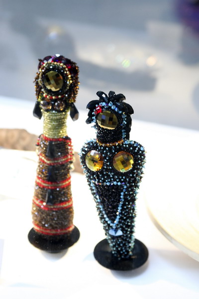 (左)以串珠一圈一圈纏繞固定,再以手工縫製飾以特殊形狀的水晶元素 。(右)每一個細小水晶皆以手工縫製,運用特殊形狀水晶表現強烈非洲風格,配色獨特。