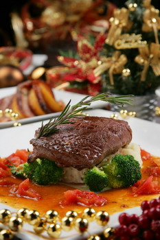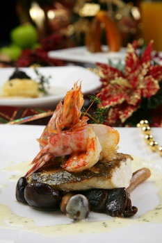 「伸適廊」主要提供歐陸創意料理,聖誕節餐以8道美味滿足愛吃的嘴,包括手工麵包、醋漬蘋果烤燻鴨胸佐咖啡醬汁、法式松露磨菇濃湯、傳統雞肉凱撒沙拉、開胃飲品梅子醋飲、雙主菜烤菌菇蒜蓉鱸魚對蝦與百里香菲力牛排佐香草蕃茄風味醬汁,最後還有主廚特製手工蛋糕和咖啡或茶。