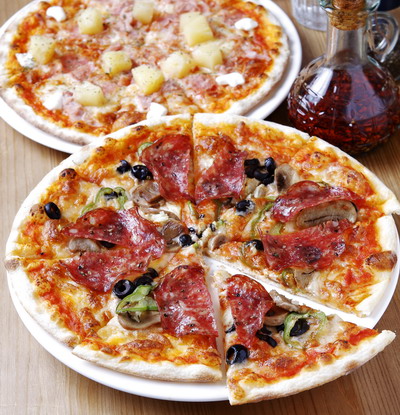 LIDO義大利傳統手工披薩280元(前)/全店以傳統義大利薄片式披薩為主,由義大利師傅傳授,現點現做。HAWAII義大利傳統手工披薩180元(後)/加入鳳梨、培根與自製白醬的披薩,味美用料又實在。