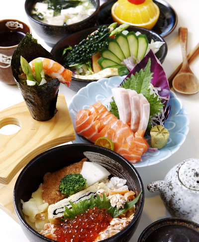 精緻套餐500元/內容相當豐富的套餐,包括鮮蝦籚筍手卷、沙拉、綜合生魚片、熟鮭魚親子丼、味噌湯與水果,營養又美味的搭配。