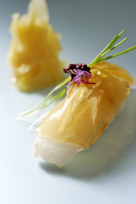 鰈魚握壽司/在鰈魚上方放上一層晶瑩剔透的特製醋凍,搭配芽蔥、四季紅,整體口感清爽清甜。