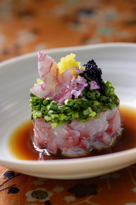野生鯛魚塔/將新鮮鯛魚切小塊狀,搭配日本蔥、法國魚子醬、醃黃蘿蔔、紫蘇花砌成如精緻甜點般的外型,食用時將各式食材拌勻後,充份享用其鮮味與各式食材搭配後的協調絕妙口感。