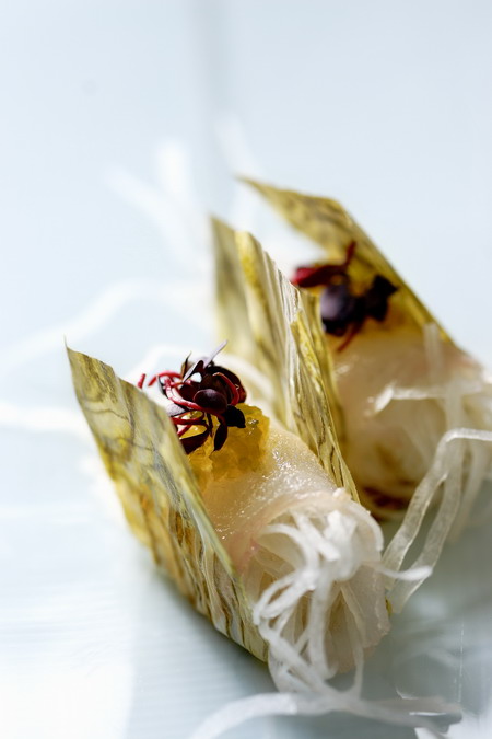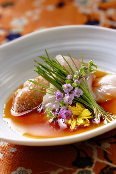 紅喉魚/略為炙燒後,引出其油香與鮮甜味,搭配芽蔥、紫蘇花及菊花瓣,入口炙燒後的迷人香氣縈繞整個口腔,令人回味無窮。