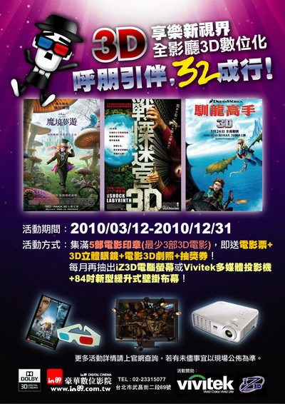 內容:集滿5部電影印章(最少3部3D電影),立即送電影票+3D立體眼鏡+電影3D劇照