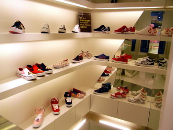 許多人都好喜歡這隻闊嘴猴啦!就進1樓的後區就馬上可以看見許多雙色彩繽紛的Paul Frank女鞋,而2樓則以充滿搖滾味、龐克味與雅痞味的酷男鞋。本季女鞋大多以粉色、愛心、花朵、印花與千鳥格打造出春心浪漫的感覺;而男鞋部份以從陳設到商品都充滿濃濃街頭時尚感。