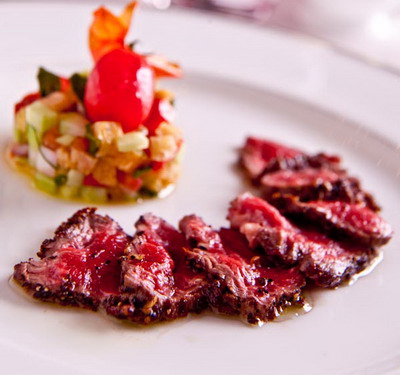 茶燻紐西蘭生牛肉佐羊乳酪起士/是以紐西蘭新鮮牛肉製成,首先需先將紐西蘭菲力修整為圓條形,以胡椒及鹽做初步調味,再快煎幾秒使表面焦褐上色即可,續以糖、茶葉、木屑等快速煙燻三分鐘,使其吸收香氣,取出置涼後再冷藏,美味肉質多汁馨香,搭配以融合蕃茄、小黃瓜、紅洋蔥、橄欖油、香料的開胃小品,以及羊乳酪,是品嚐紐西蘭獨特料理風味與新鮮牛肉的首選。