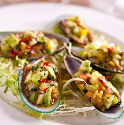 蒸煮鮮淡菜佐咖哩醬汁與奇異果沙沙醬/淡菜是紐西蘭常見食材,將淡菜汆燙後,搭配以橄欖油、甜椒、奇異果丁等調配的沙沙醬,清新風味搭配新鮮淡菜,如同置身純淨紐西蘭。