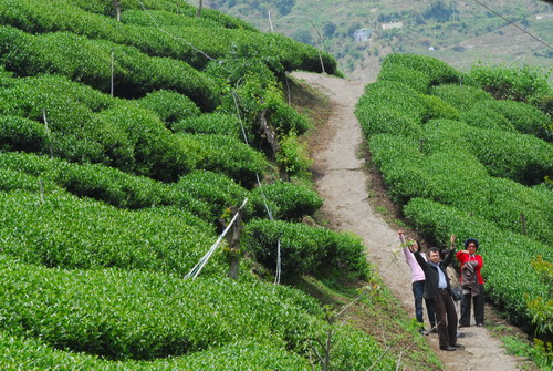 終於結束了抖腳的短暫旅程抵達私人的「天府農場」,農場裡有段媽媽親手栽植的茶園、蘋果樹、水蜜桃、葡萄及柿子等多樣有機蔬果,整片綠油油的茶園彷彿來到廣告中的世界(徐若瑄的御茶園),雖然走在山坡邊的小路令人膽顫心驚(聽起來很苦的膽不知道被誰吃了!)不過看到段媽媽親自配植的果樹結實累累,宛如進入現實的開心農場世界,看到什麼小花小草都好神奇的感覺。