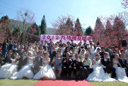每年在西洋情人節舉辦的櫻花集團婚禮,今年如期在九族文化村滿園盛開的櫻花林中舉行,這項九族櫻花祭最浪漫的招牌活動「九族櫻花纜車婚禮」一共有50對新人報名爭取26對名額,所有的新人在盛開的櫻花與許景淳的「櫻花開幸福來」歌聲中,獲得南投縣陳副縣長志清、日月潭國家風景區管理處張振乾處長與九族文化村張鴻秋總經理等貴賓的福證,與在場所有遊客與親友的祝福下,完成一場最甜美浪漫、與最多祝福的婚禮。