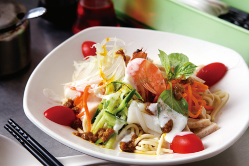 叻沙三鮮涼拌義麵90元/用咖哩、蝦米、南薑等香料製成,加上椰奶後口味豐富且溫順。