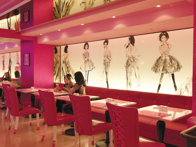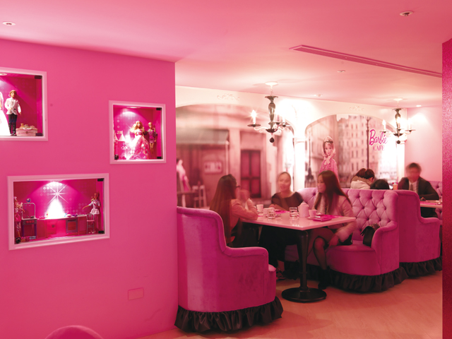 一進到店裡就像來到芭比的桃紅世界,每個區域設計更融入芭比娃娃、配件及品牌logo等元素,還有獨家設計的提包造型沙發、行李箱坐椅、茶壺吊燈等擺設,彷彿置身芭比時尚派對中。