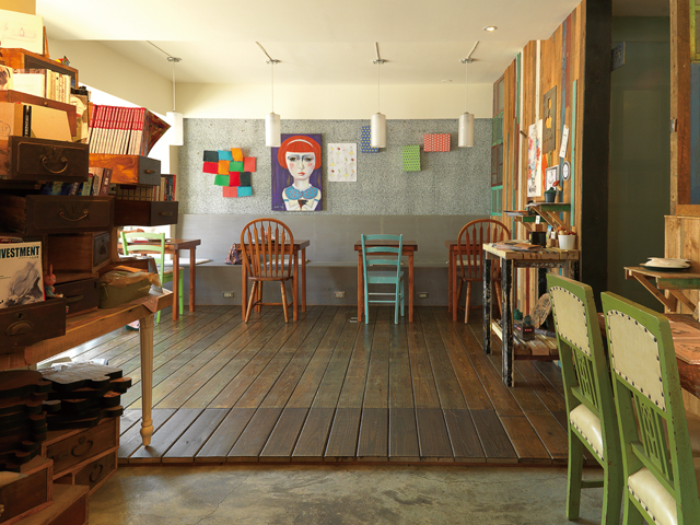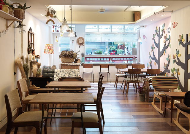 店內佈置皆出於夫婦2人之手,甚至不辭辛苦從歐洲、韓國扛回二手椅,以大量木頭傢俱及地板營造出純樸清新色調,再以女主人手作拼布及乾燥花作品點綴其間,讓人彷彿置身歐洲鄉村般的悠閒自在。店內另闢雜貨販售區,讓客人也能將幸福感帶回家。